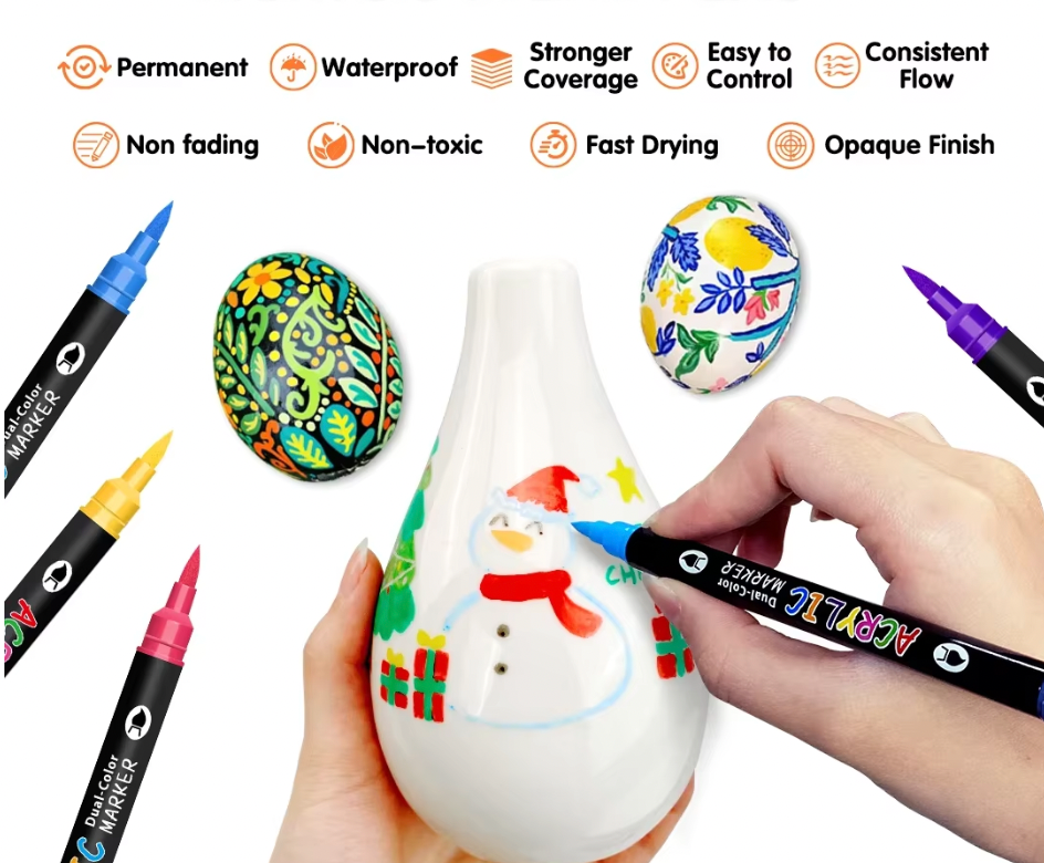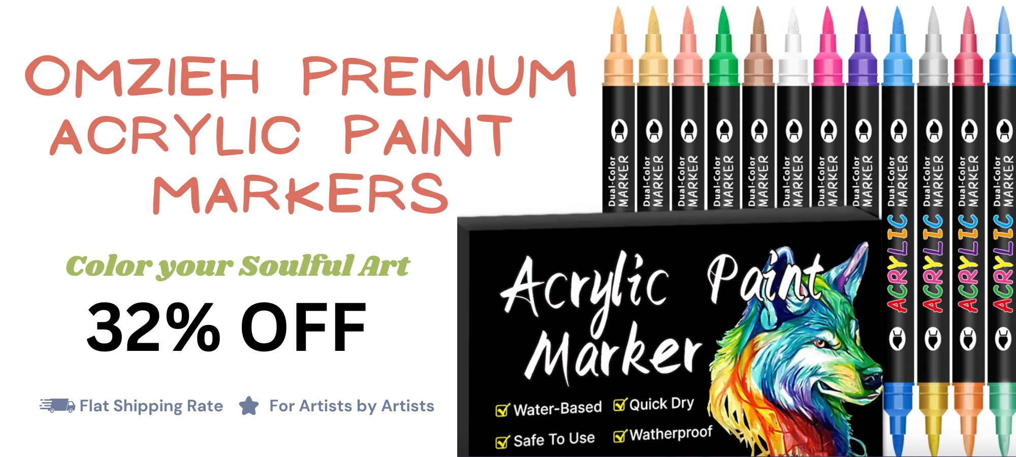 Omzieh Dual-Tip Acrylic Paint Markers – Set of 12 with 24 Vibrant Colors for Mixed Media Artists | Soft Brush, Dual-Color Design for Canvas, Wood, Glass & Beyond